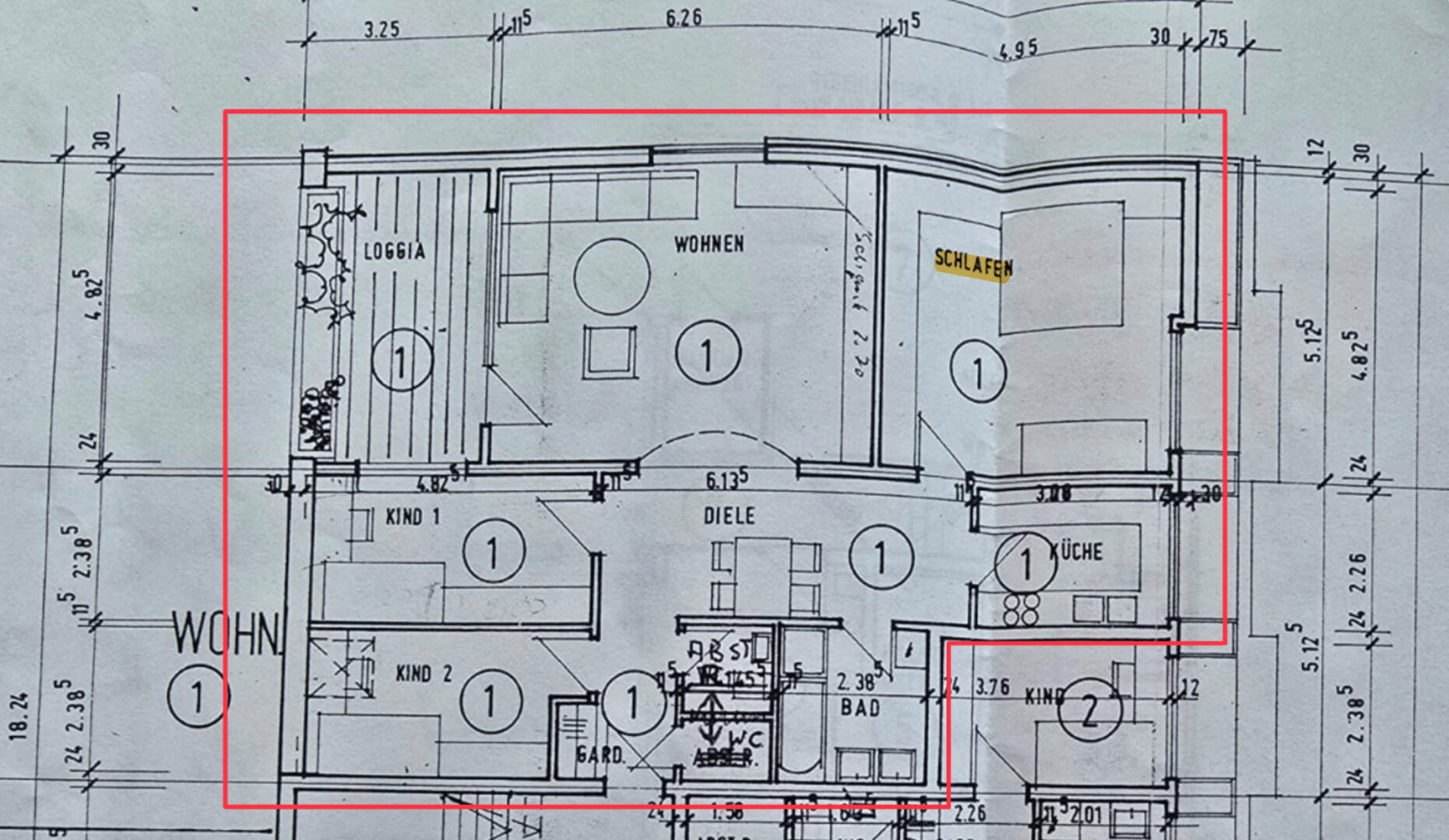 Vier gut geschnittene Zimmer ermöglichen eine flexible Nutzung als Wohn- und Essbereich, Elternschlafzimmer sowie Kinder- oder Arbeitszimmer. Der freundliche Wohnbereich bildet das Herzstück der Wohnung und überzeugt durch seine helle, angenehme Atmosphäre. Von hier aus besteht direkter Zugang zur sonnigen Loggia, die sich ideal für entspannte Stunden im Freien eignet.